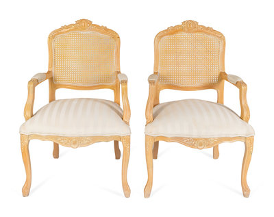 each with caned back, upholstered seat and padded armrests.