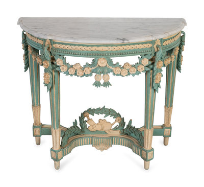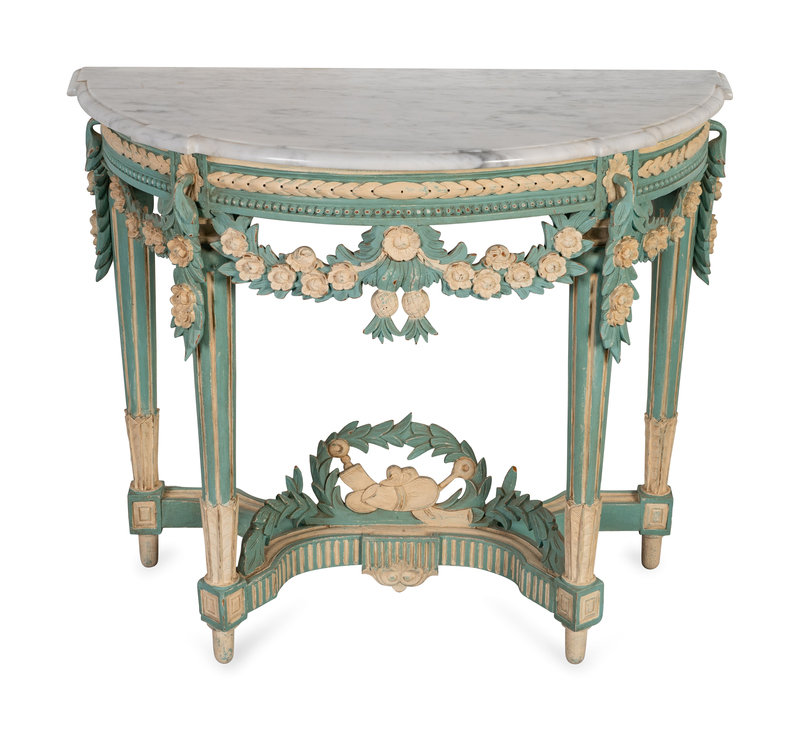 A Louis XVI Style Marble Top Polychromed Demi-lune Console