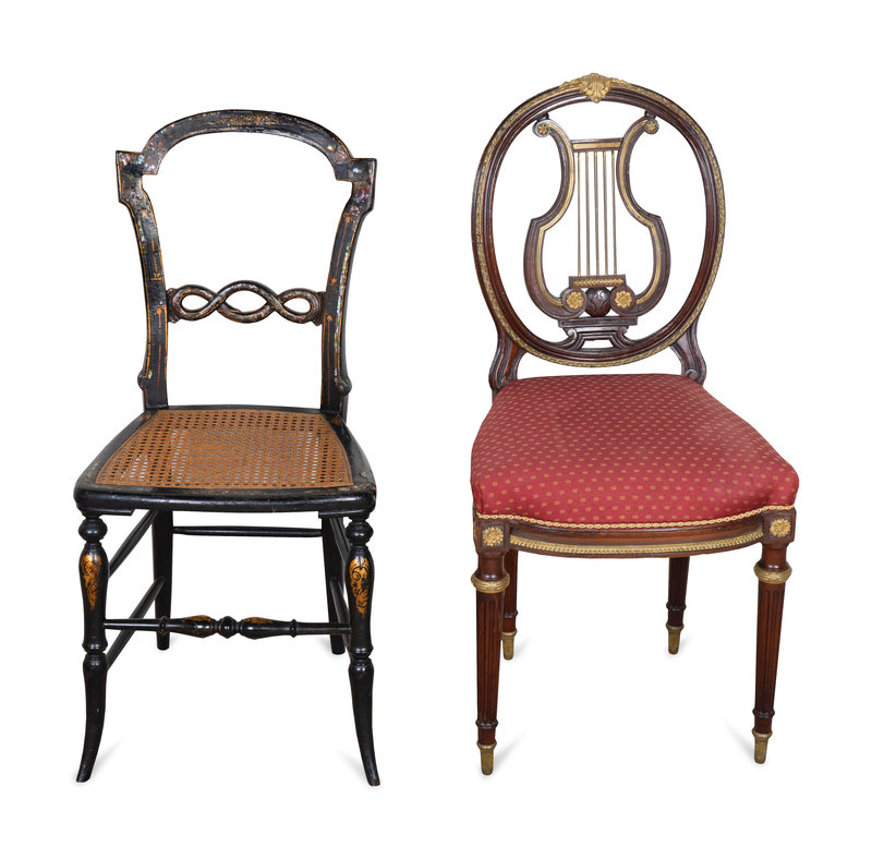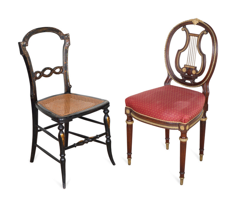 A Victorian Mother-of-Pearl Inlaid Side Chair and a Gilt-Bronze-Mounted Lyre-Back Side Chair
