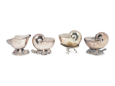 comprising two nautilus form with shell thumb pieces, one nesting in a shell-form dish raised on coral form legs, together with a conch shell form on a cast naturalistic base.