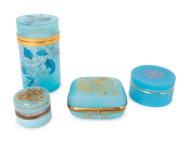 comprising a tall cylindrical, two round covered boxes and a rectangular box with floral decoration.