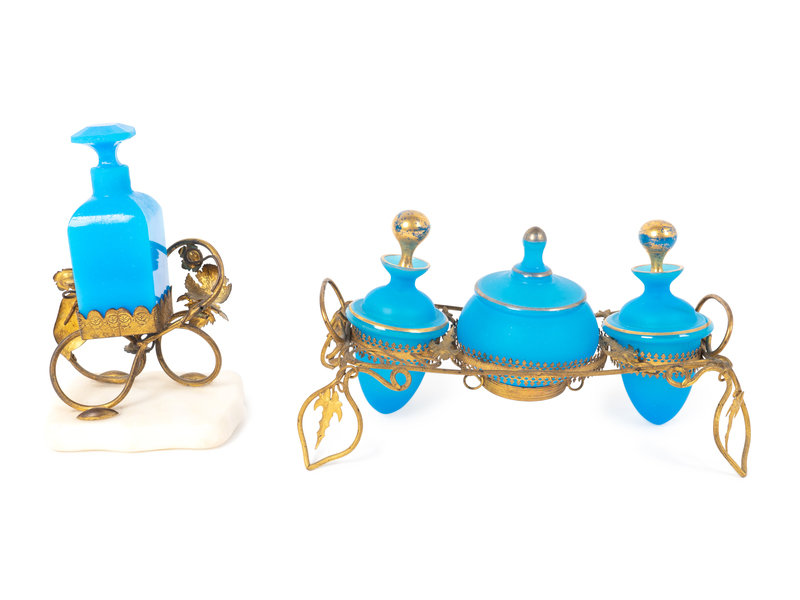 Two Gilt Metal and Blue Opaline Glass Dresser Sets