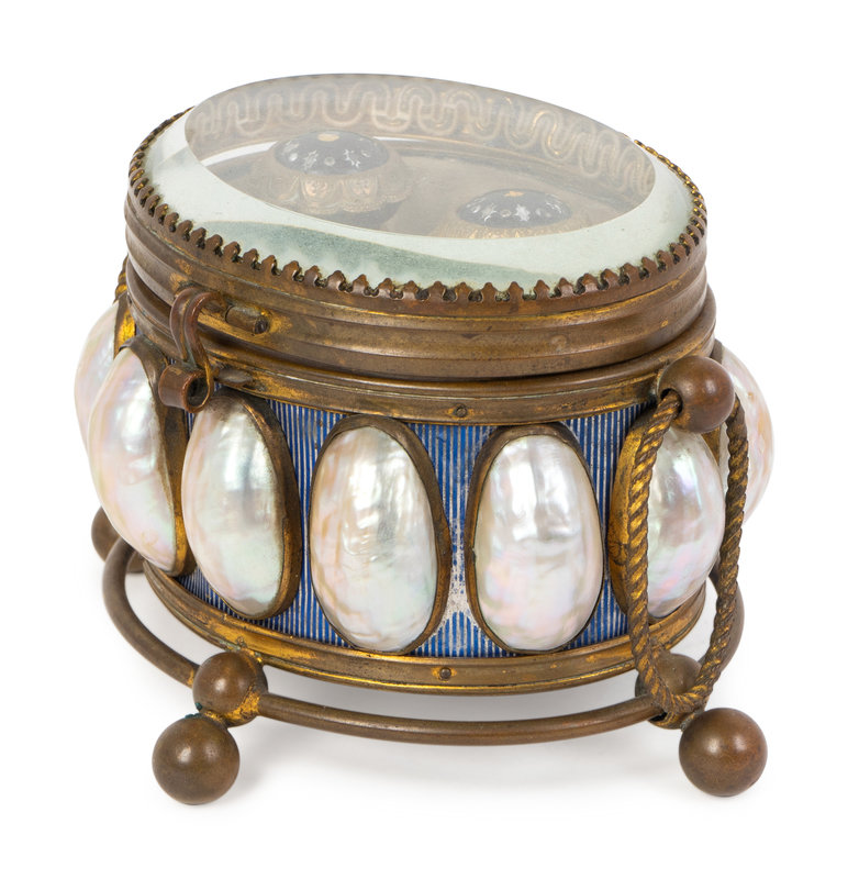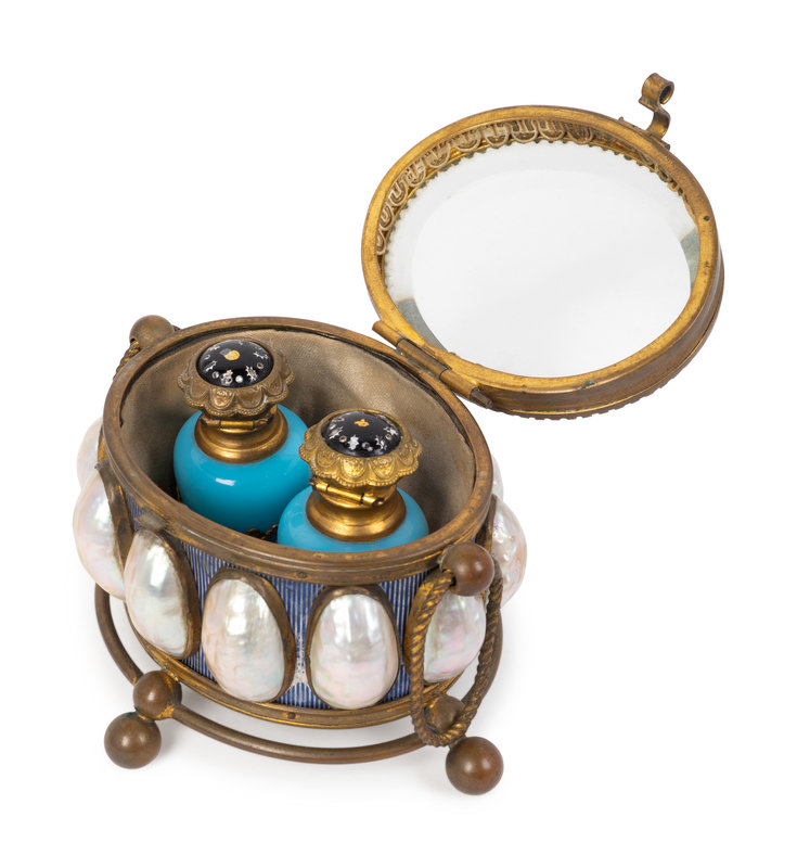 the caddy with a clear glass lid surmounting a mother-of-pearl decorated body and raised on ball feet, the interior with two inset blue opaline glass scent bottles with an enameled lid.