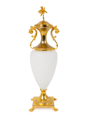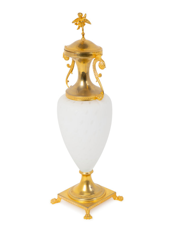 having a putti finial surmounting the baluster form body and raised on four paw feet.