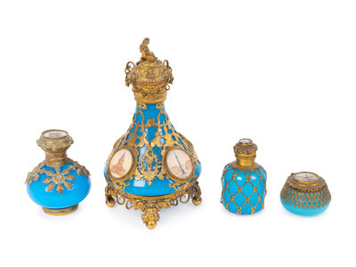 Three French Gilt Bronze Mounted Blue Opaline Glass Scent Bottles and a Covered Box