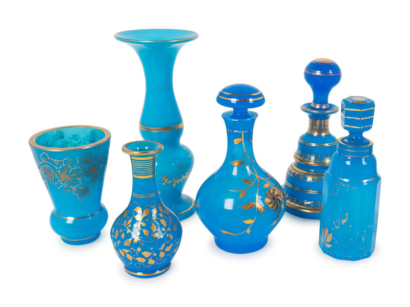 A Collection of Seven Gilt-Decorated Blue Opaline Glass Articles