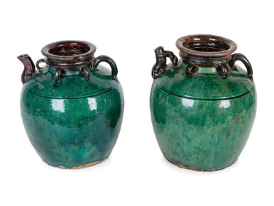 A Near Pair of French Dark Green Glazed Pottery Gargoulette Pitchers
