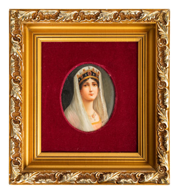 Painted by Wagner, signed, depicting a royal lady wearing a tiara set with rubies and pearls, signed Wagner lower right; in a giltwood frame.