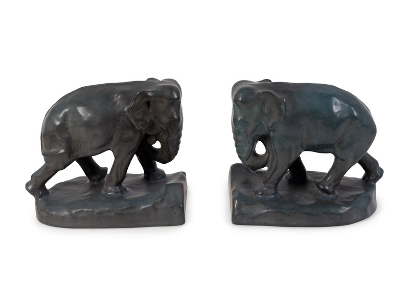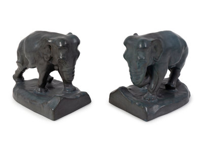 A Pair of Rookwood Green-Glazed Pottery Elephant Bookends