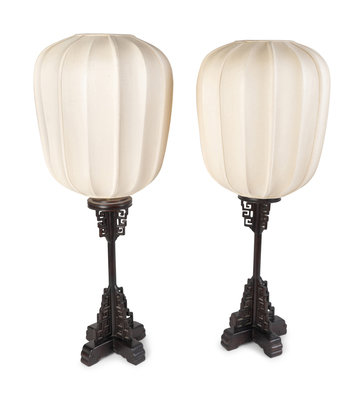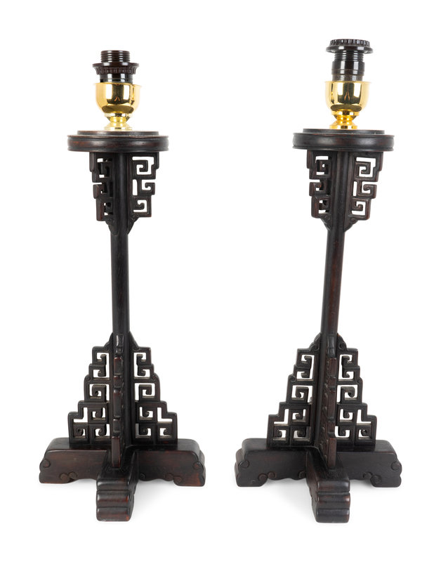 A Pair of Chinese Style Pierced and Ebonized Wood Table Lamps
