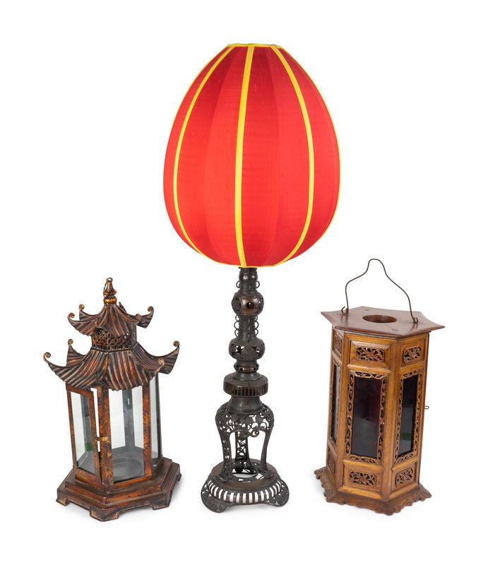 comprising a hexagonal carved wood and glass paneled lantern, a pagoda form patinated metal and glass lantern, and a bronzed metal base lamp with red and yellow silk cocoon shade.