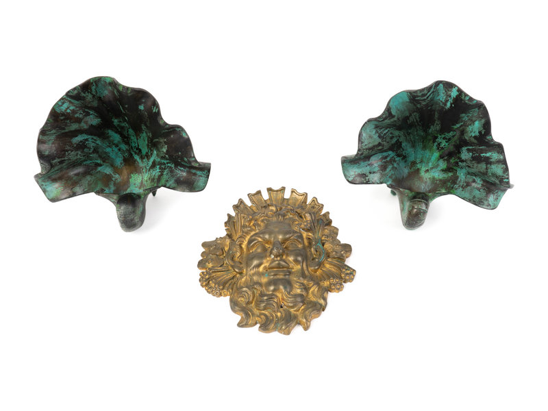 A Pair of Leaf-form Bronze Bookends and a Gilt Bronze Mask