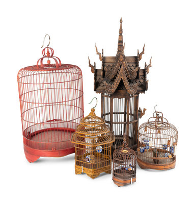 One painted red, one carved temple style, and three with blue and white porcelain accessories.