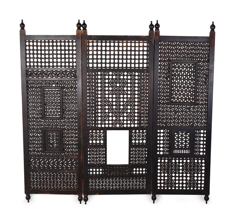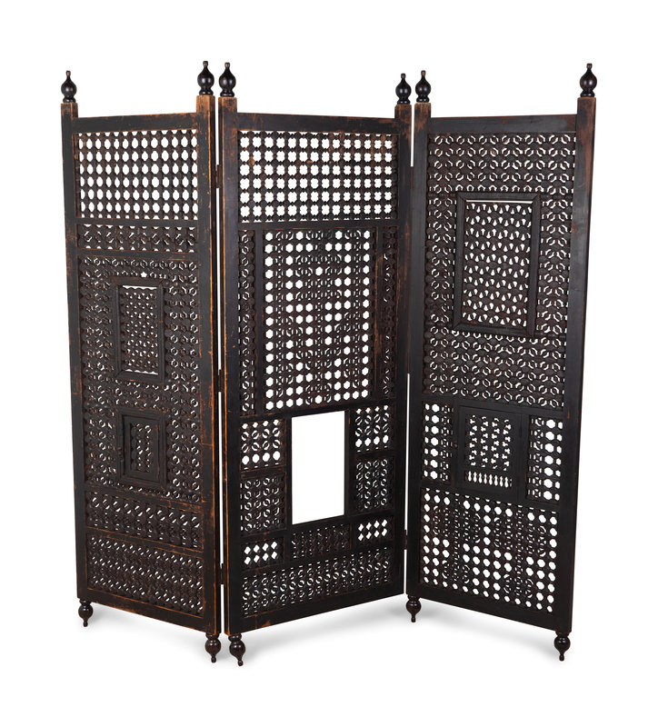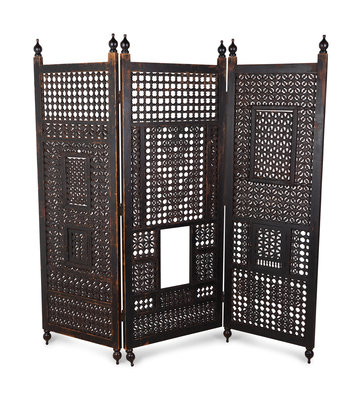 An Indian Pierced Carved Teak Three-Panel Floor Screen