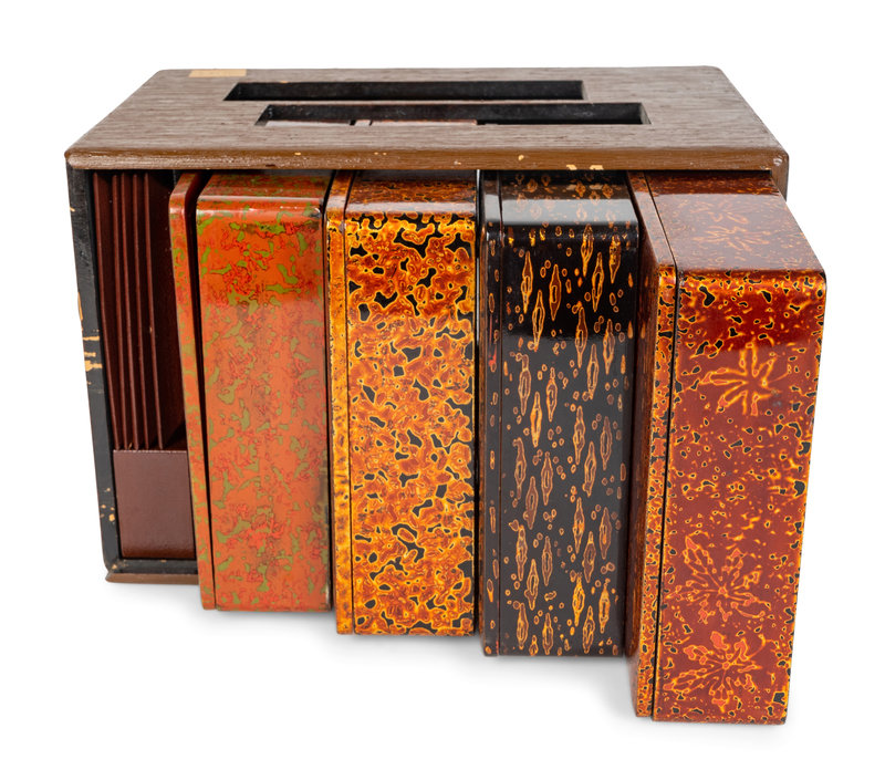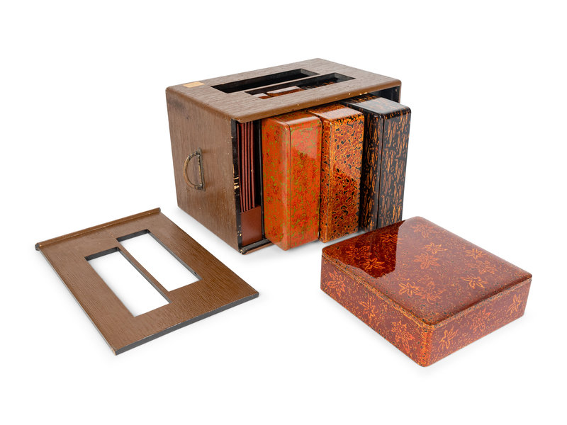 Five Japanese Lacquer Bento Boxes and Accessories in a Painted Wood Carrying Case