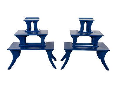 A Pair of Blue-Painted Three Tier Side Tables