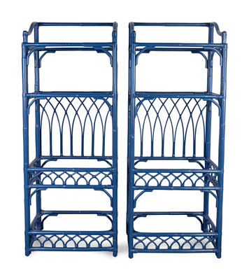 A Pair of Contemporary Blue-Painted Rattan Bookshelves