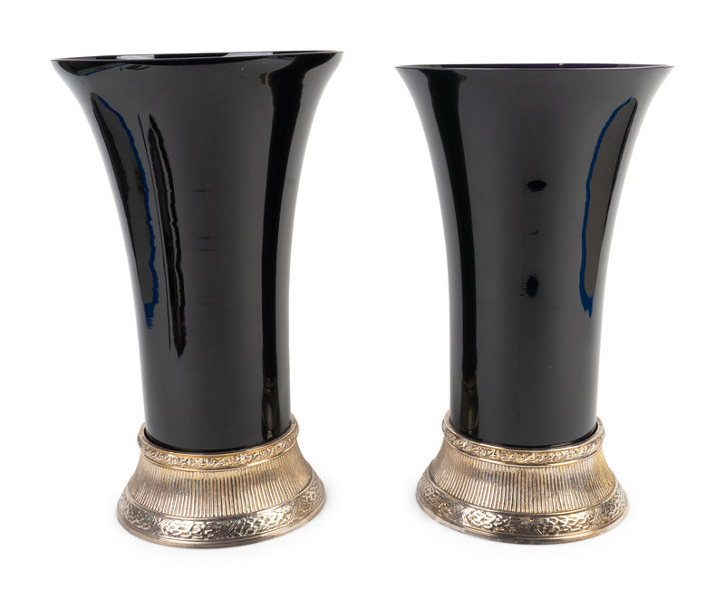A Pair of Art Deco Style Black Glass Vases on Silvered Metal Bases