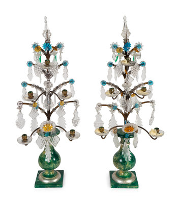 A Pair of David Barrett Faux Marble and Glass Beaded Candelabrum