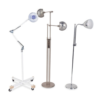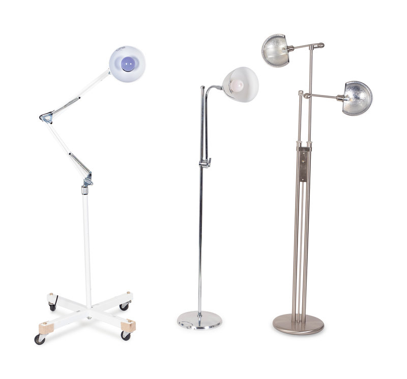 comprising two angle lamps, one in stainless steel, the other painted white, and a two-light adjustable stainless steel floor lamp,
