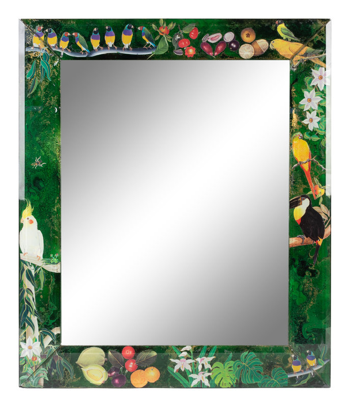 A Reverse Painted Mirror depicting Tropical Flora and Fauna