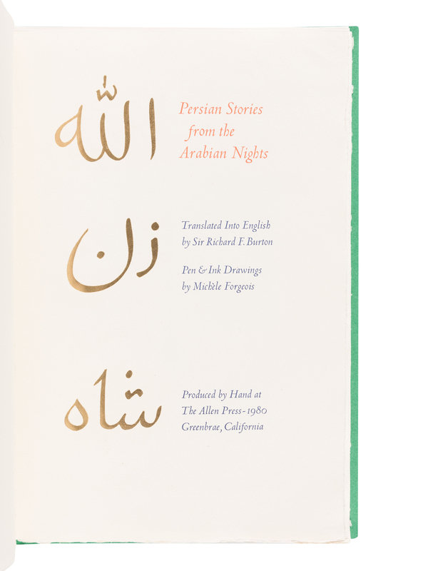 [ALLEN PRESS]. BURTON, Sir Richard, translator (1821-1890). Persian Stories from the Arabian Nights. Kentfield, CA: Allen Press, 1980.