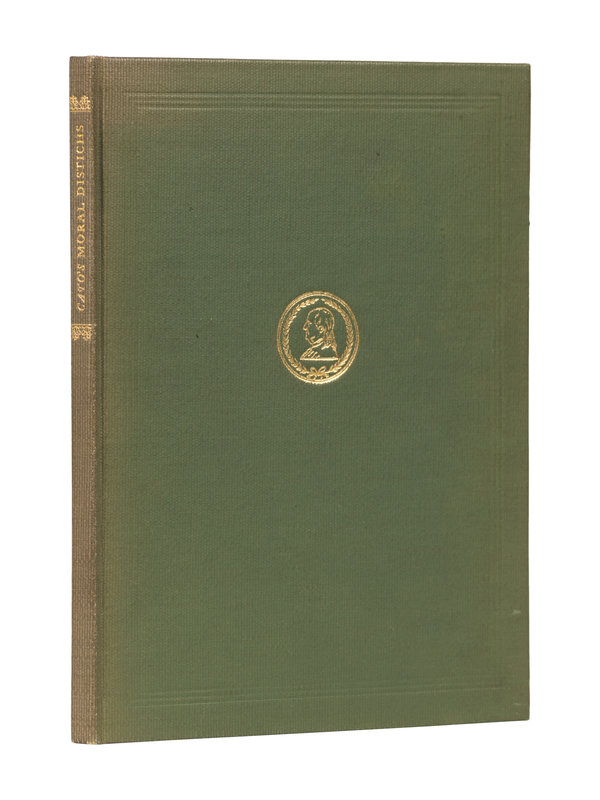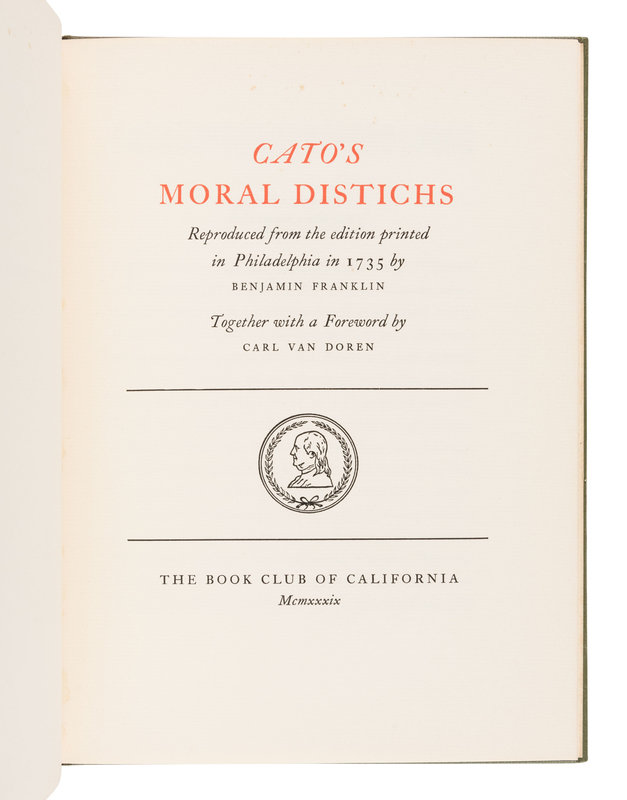 [BOOK CLUB OF CALIFORNIA]. [FRANKLIN, Benjamin (1705-1790)]. Cato’s Moral Distichs. Reproduced from the Edition Printed in Philadelphia in 1735 by Benjamin Franklin. Los Angeles: The Ward Ritchie Press for the Book Club of California, 1939.