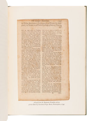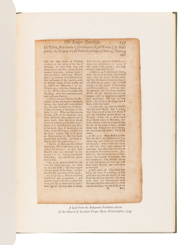 8vo. Original leaf from the Church of Scotland Prayer Book, printed by Benjamin Franklin (Philadelphia, 1745), bound in; 24pp. facsimile of Cato's Moral Distichs printed by Franklin throughout. Original green cloth gilt.