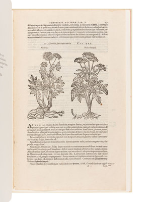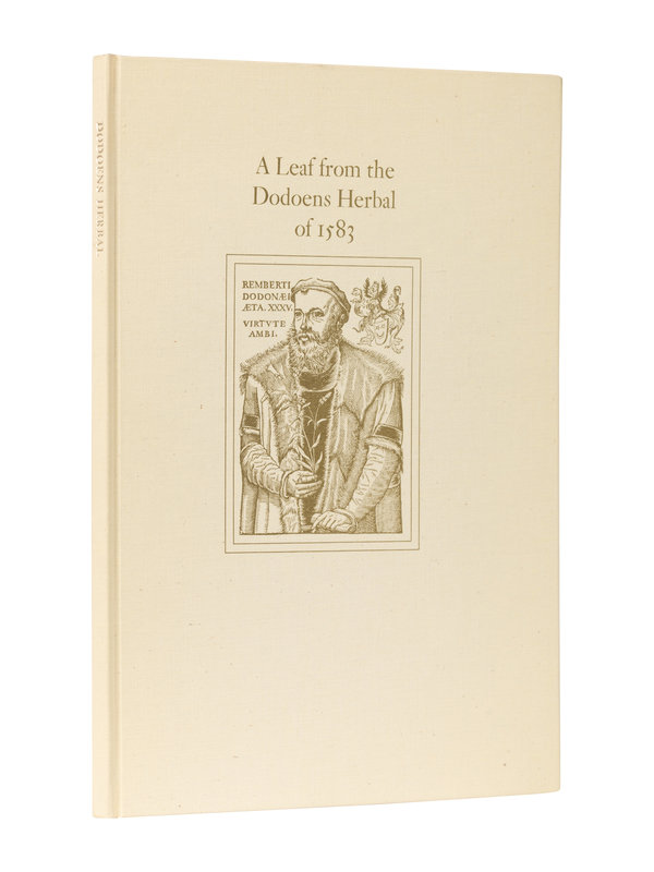 Folio. Printed leaf from the 1583 edition of Dodoens’s Herbal bound in (leaf d3). Numerous illustrations. Original cream illustrated cloth, spine gilt-lettered.