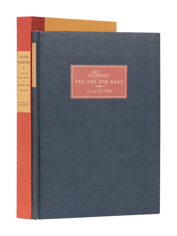 HALL, Carrol D.. Bierce and the Poe Hoax. 1934. 4to. Publisher’s cloth. -- Dear Master. Letters of George Sterling to Ambrose Bierce 1900-1912. 2002. 4to. Original cloth-backed boards; original slipcase. – Together 2 works in 2 volumes, both printed in San Francisco by the Book Club of California. Condition fine.