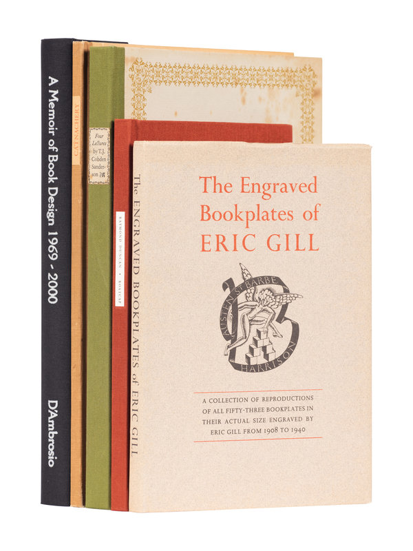 MUIR, P.H.. Catnachery. 1955. Tall 4to. Brown cloth with decorated boards; glassine. -- DREYFUS, John. Four Lectures by T.J. Cobden-Sanderson. 1974. 4to. Green-cloth backed boards; paper name plate on spine. -- SKELTON, Christopher, compiler. The Engraved Bookplates of Eric Gill, 1908-1940. 1986. 8vo. Red cloth; original dust jacket. -- ROATCAP, Adela Spindler. Raymond Duncan. Printer… Expatriate… Eccentric Artist…. 1991. 8vo. Burgundy cloth. -- D’AMBROSIO, Joe. A Memoir of Book Design, 1969-2000. 2003. 4to. Half-cloth and patterned boards; glassine. Prospectus laid in. -- GREENWOOD, Robert. A Valiant Enterprise. 2007. 8vo. Cloth. Original shipping carton. Prospectus laid in. -- Together 6 works in 6 volumes, all printed in San Francisco by the Book Club of California. Condition generally fine.