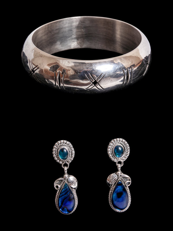 Navajo Sterling Silver Paua Shell Earrings and Silver Bangle Bracelet