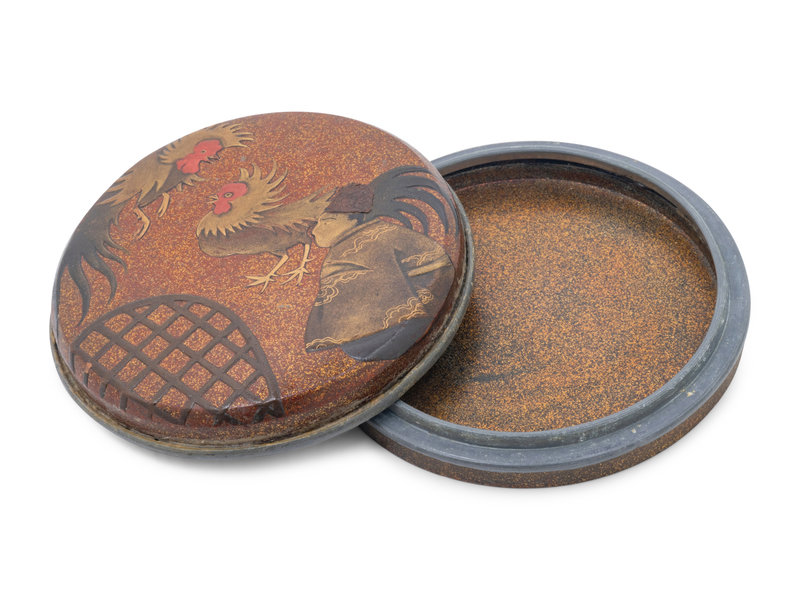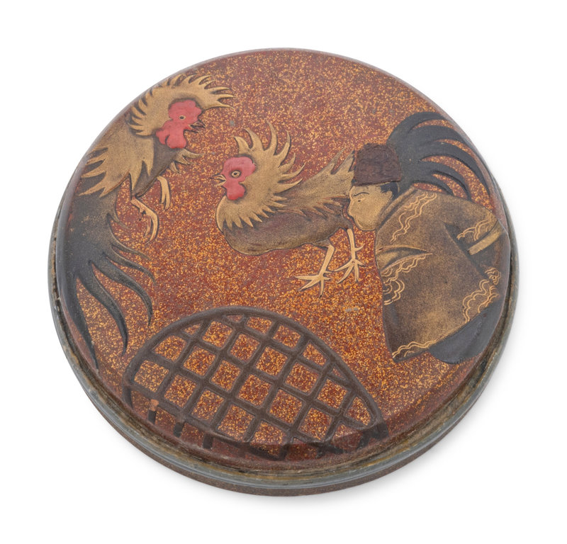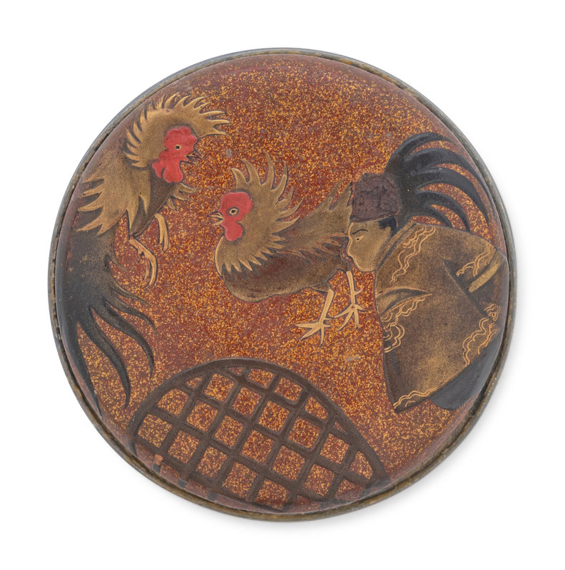 of circular form, the cover decorated with a man and two rosters, against a nashiji ground.