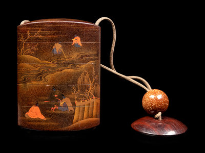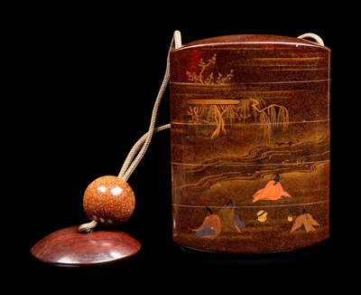 of wide form, lacquered with scholars at various tasks alongside a river stream, all set on a mura-nashiji ground, the interior of nashiji, signed Taigyo saku with red pot seal sai to the underside; with a silver inlaid hardwood netsuke decorated two incised shishi lions.