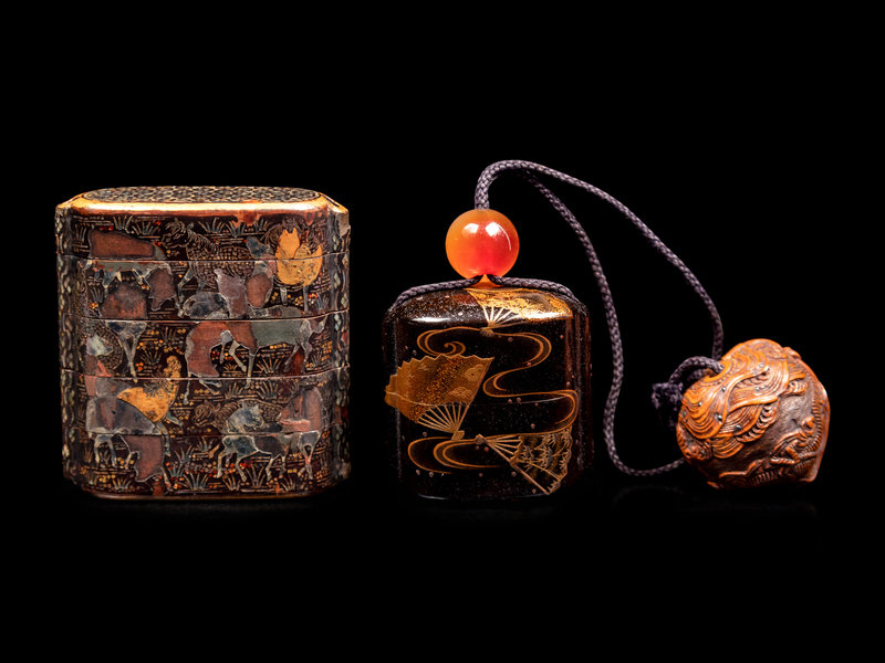 the larger four-case example decorated with gold and mother-of-pearl inlays depicting various horses in an outdoor scene, the interior lacquered black, the smaller example decorated in gold hiramaki-e and hirame with five folding fans, the interior of nashiji, with boxwood peach-form netsuke carved with dragon motif, signed Kozan; both inro unsigned.