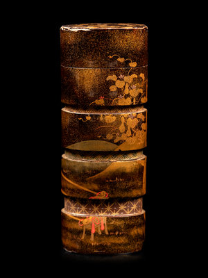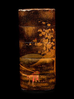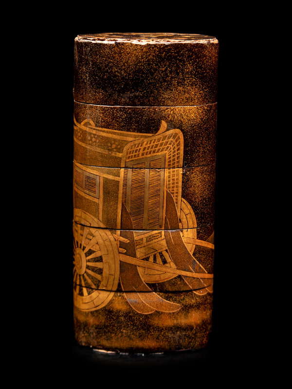 the black lacquer ground decorated with hirame and lacquered with a carriage on one side, leafy gourd vines and mountains on the reverse, the top of the cover and the underside also decorated with gourd vines, the interior lacquered gilt, signed Yoyusai to the underside.