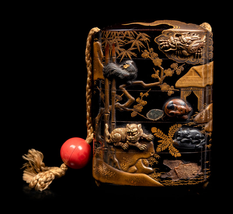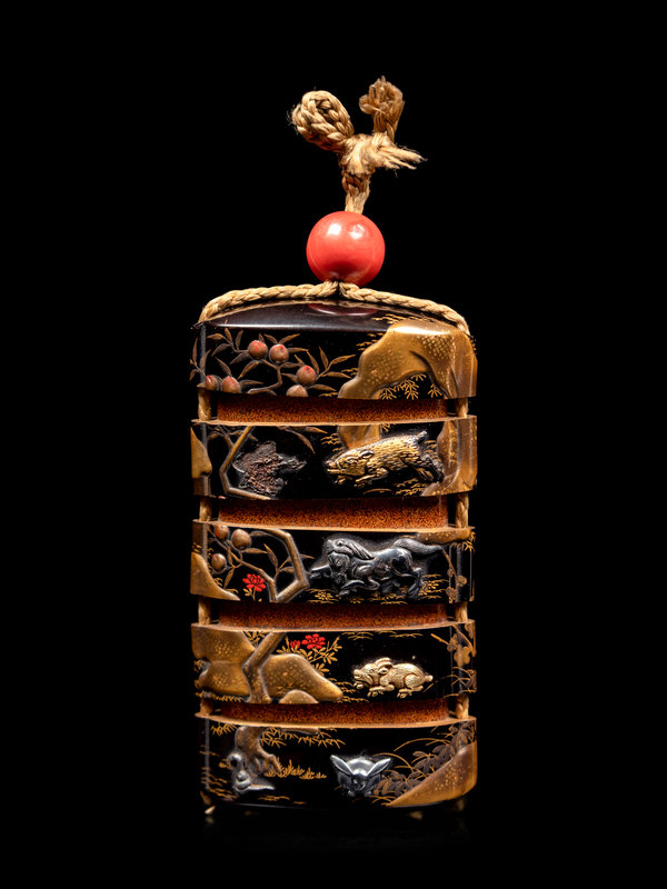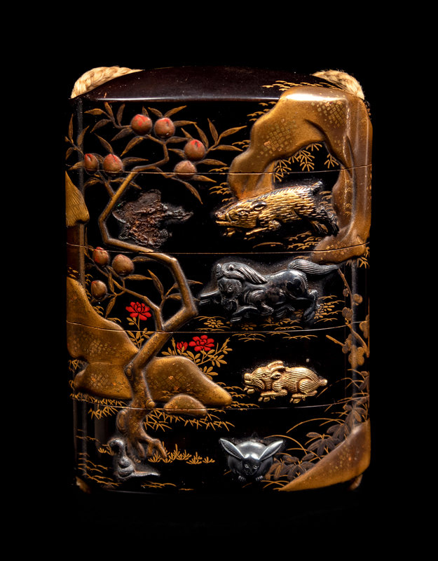 the rich roiro ground lacquered in gold takamaki-e with highlights of kirikane, showing a continuous outdoor scene with a house besides rockery between bamboo, blossoming prunus trees and fruiting peach trees, inlaid with mix-metal twelve zodiac, the interior of nashiji, inscribed on an inlaid mother-of-pearl tablet Hogyoku; with a red glass ojimi.