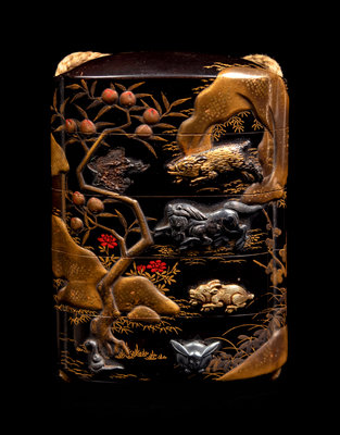 A Mixed-Metal Inlaid Gold and Black Lacquer Four-Case Inro