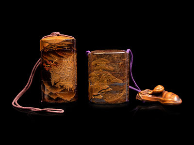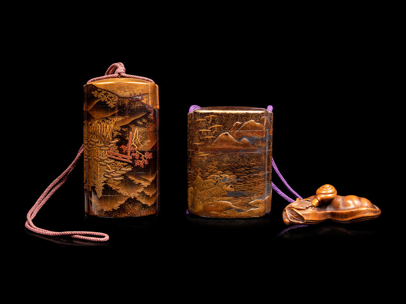 each decorated in shades of gold hiramaki-e on a black ground sprinkled with hirame, the interiors of nashiji, the larger example decorated with a mountain scene with an archway and three deer, the smaller example decorated with a riverscape scene with houses and trees on riverbank, figures in a boat on the river, with a boxwood netsuke in the form of a peapod with a snail climbing atop; both unsigned.