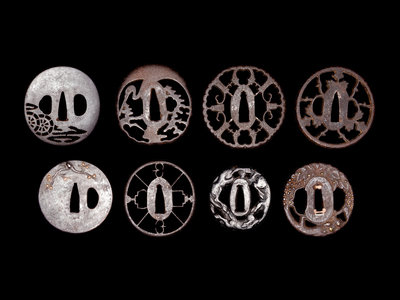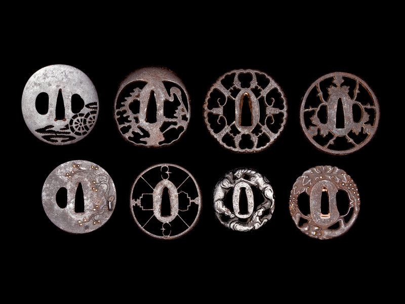comprising two circular examples with gold inlays depicting flowering trees and leafy branches, one circular example decorated with three horses, signed Bushu Ju Masatsune Saku 武川住 正恆作, a larger circular example with reticulated wheels, signed Kofu Ju Tatsutoshi 江府住 並壽, four circular openworked examples decorated with leaf motif.