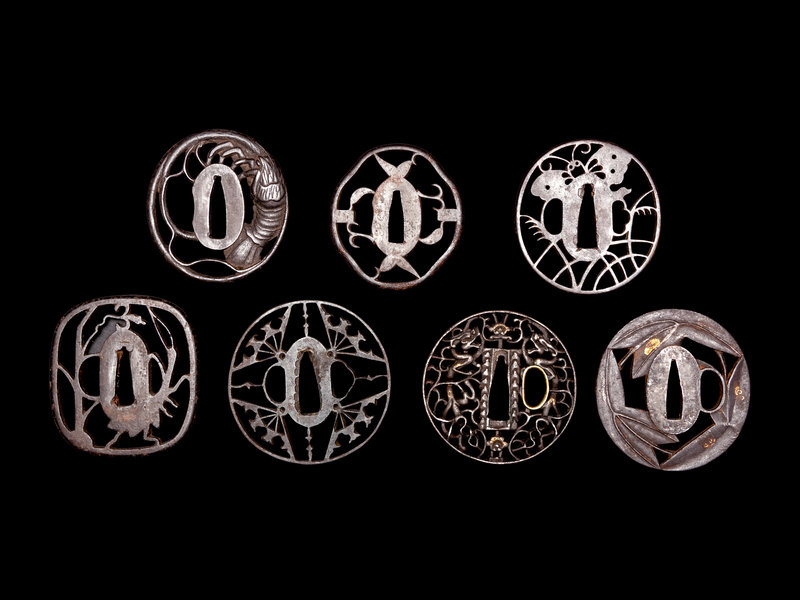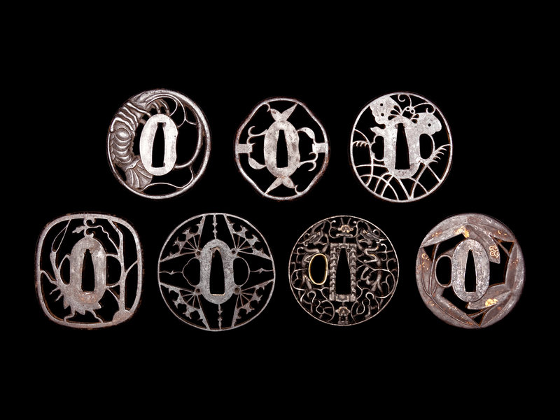 comprising a circular example with gold inlays decorated with leaves, signed 江府住正義, a circular example with brass and gold inlays showing a pair of dragons amongst entwined branches, four reticulated examples showing fans, leaf motif, crayfish, grasses and a butterfly.