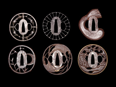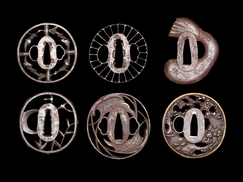 comprising five of sukashi type, the first depicting samurai figures underneath prunus branches, with gold inlays and a brass rim, the second showing ginko leaves with gold inlays, the third and fourth decorated openworked branches, the fifth decorated with a circle of radiating leaves; the sixth in the form of a bag of Hotei; all unsigned.