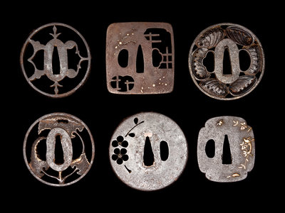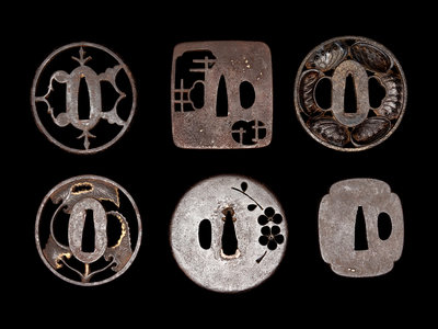comprising a mokko-form example with mixed metal inlays showing floral sprigs, a circular example with gold inlays with large leaves, a square example with minor gold inlays and with geometric design, three reticulated examples, the first decorated with butterflies, the second and third with floral motifs, one signed tadatsugu 忠次.