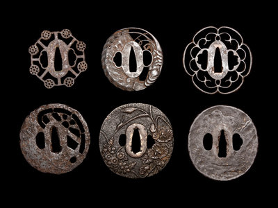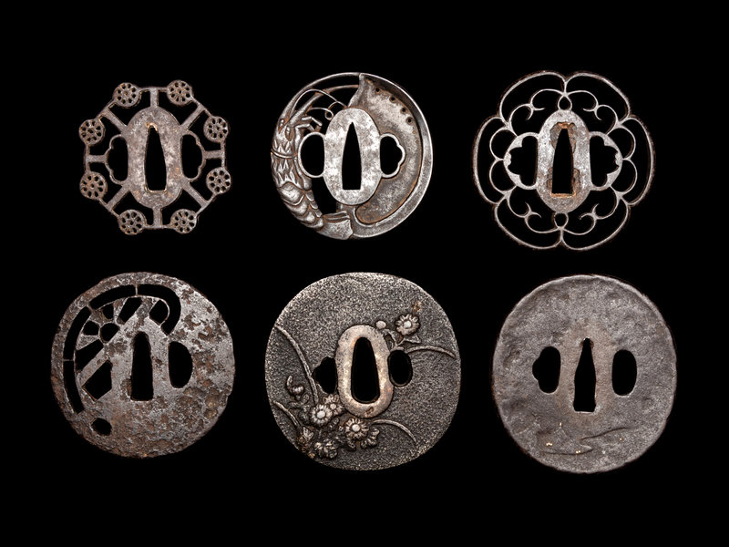 comprising a circular example with gold inlays depicting birds in flight in landscape, a larger circular example showing blossoming chrysanthemums, four reticulated examples with one showing a cray fish, the other three with foliate and floral motifs; all unsigned.