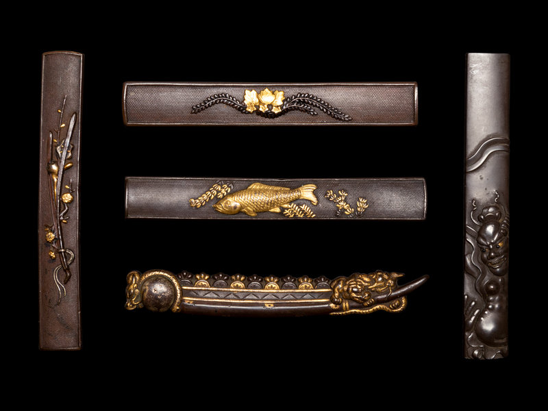 each with mixed metal inlays, comprising one depicting a wrathful guardian, two showing flowering branches, one decorated with a carp and one with mythical beast; all unsigned.