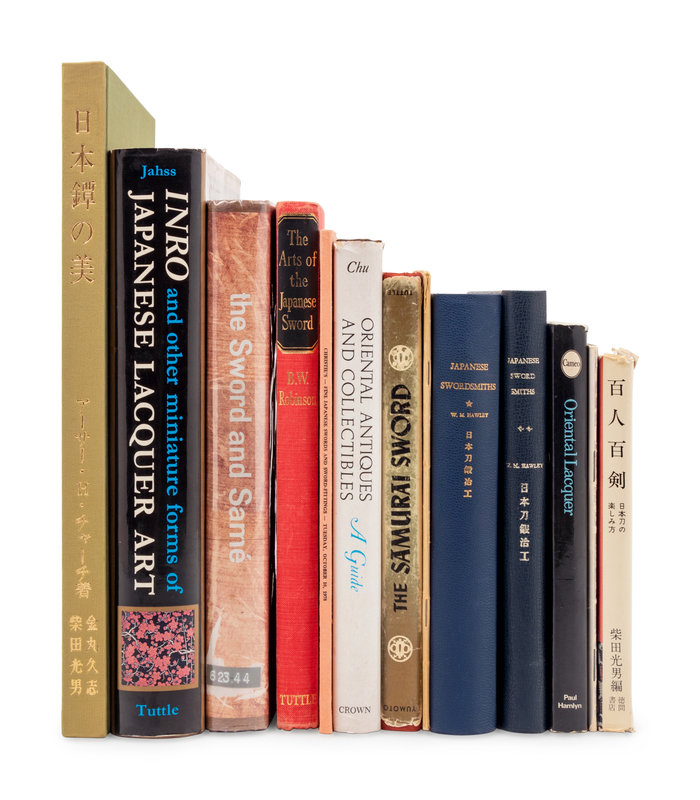 Japanese Sword Guards: Some Tsuba in the Collection of Sir Arthur H. Church. Privately printed, 1914.--JOLY, Henri and Inada Hogitaro. The Sword and the Samé. London: Tuttle, 1962.--HAWLEY, W.M. Japanese Swordsmiths. Vol 1-2. Privately printed, 1966-7.--SHIBATA, Mitsuo. Hyaku hito kyahu ken. Tokyo: Tokumashoten, 1966.--JAHSS, Melvin and Betty. Inro and other miniature form of Japanese Lacquer Art. Tokyo: Tuttle, 1971.--LUZZATO-Blitz, Oscar. Oriental Lacquer. London: Paul Hamlyn, 1969.--Chrisite's London, Fine Japanese Swords and Sword-Fittings, 10 October 1978.--YUMOTO, John M. The Samuri Sword: A Handbook. Rutland, Vermont & Tokyo: Tuttle, 1965.--GUNSAULUS, Helen C. The Japanese Sword and its Decoration. Field Museum: Chicago, 1924.-- ROBINSON, Russell. A Short History of Japanese Armor. London: Her Majesty's Stationary Office, 1965.--ROBINSON, B.W. The Arts of the Japanese Sword. Rutland, Vermont: Tuttle, 1961.--CHU, Arthur and Grace. Oriental Antiques and Collectibles: A Guide. New York: Crown, 1973.