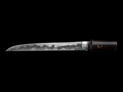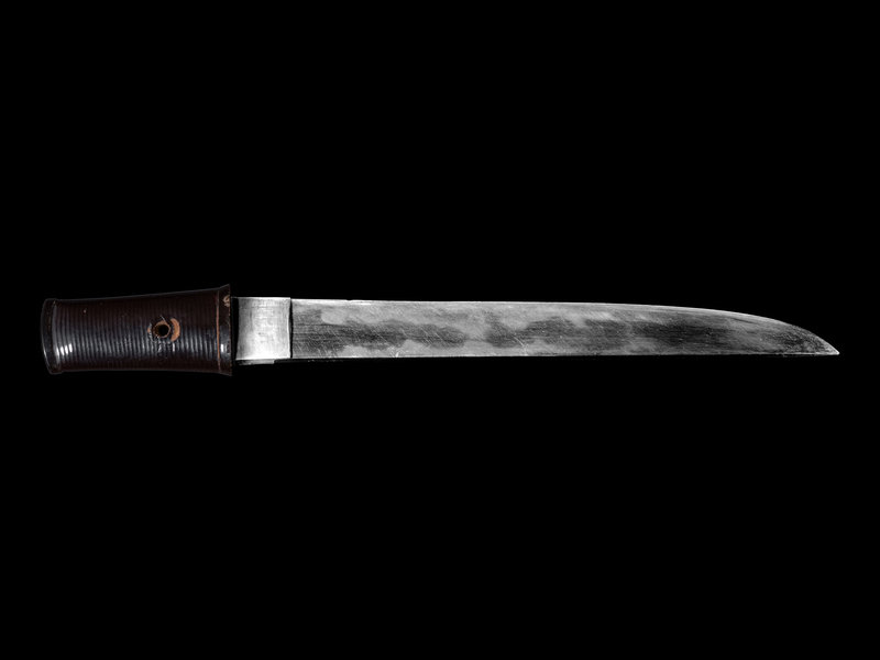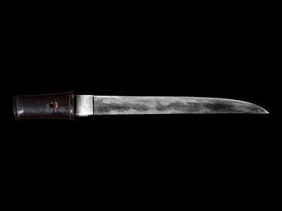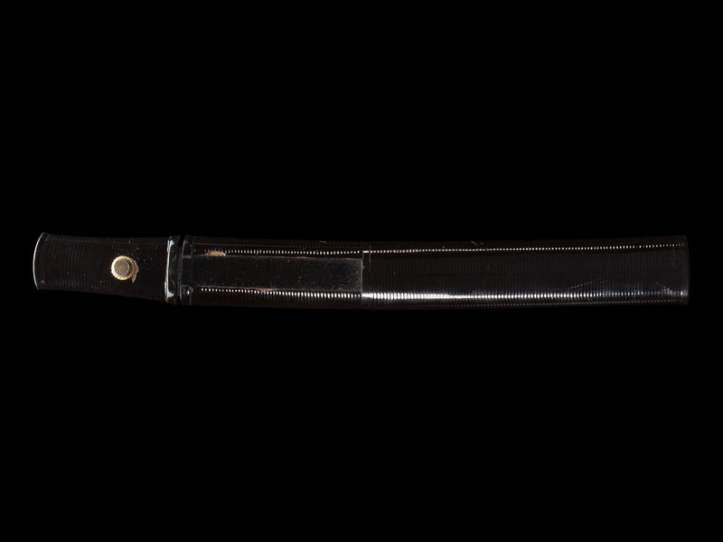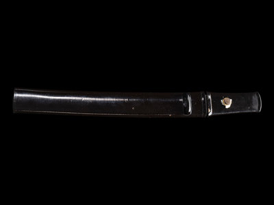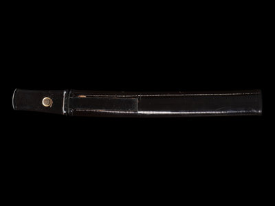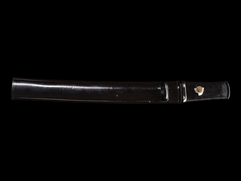 aikuchi lacquered mounts, blade of hirazukuri form and a midare hamon is visible.
