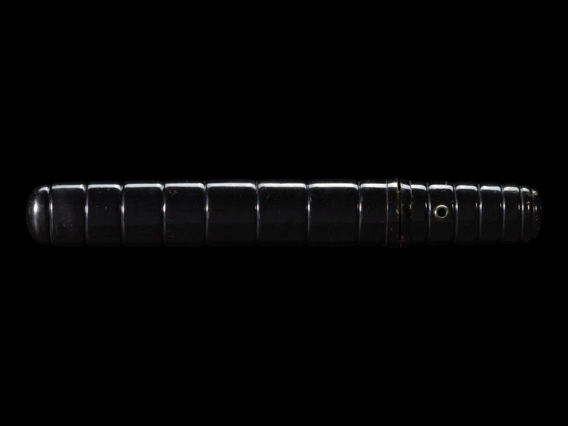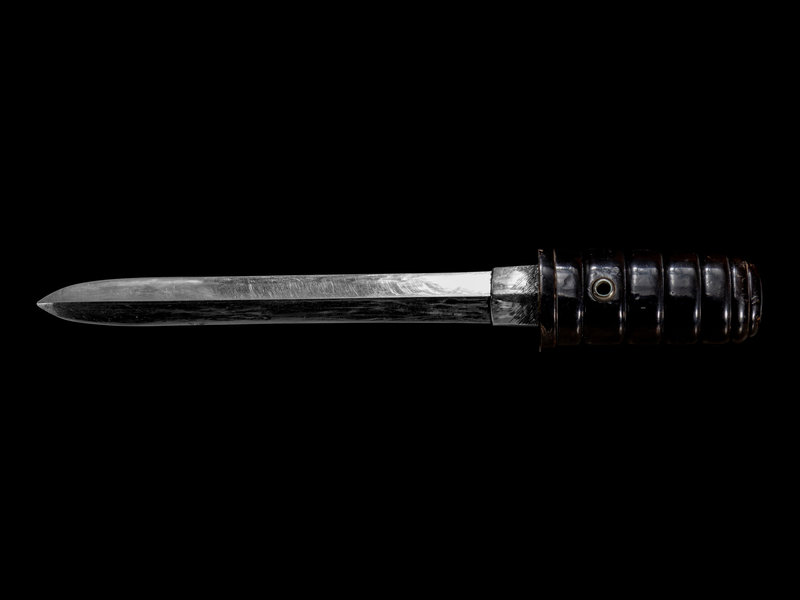 the black lacquered aikuchi tanto mounted yari/ken, silver waribashi signed Sadamitsu with family crest.