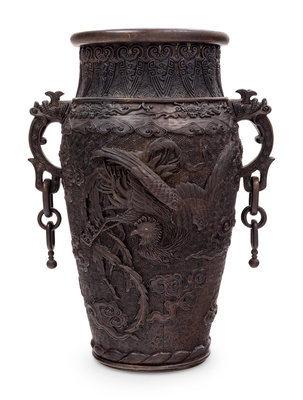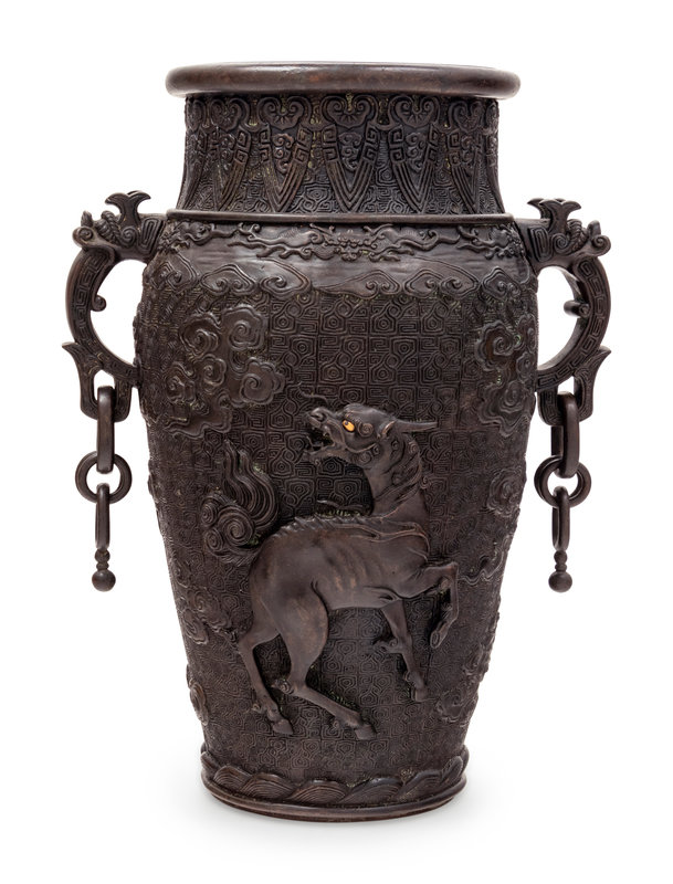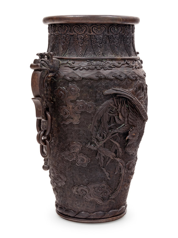 having a baluster body flanked by a pair of dragon head-form handles suspending loose rings, finely cast to show a kirin and a ho ho bird amongst underneath clouds and cicada blades, all set above a scrolled ground, bearing a three-character maker's mark, 整樂鑄 to the underside.