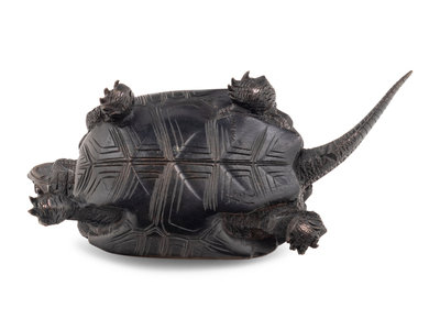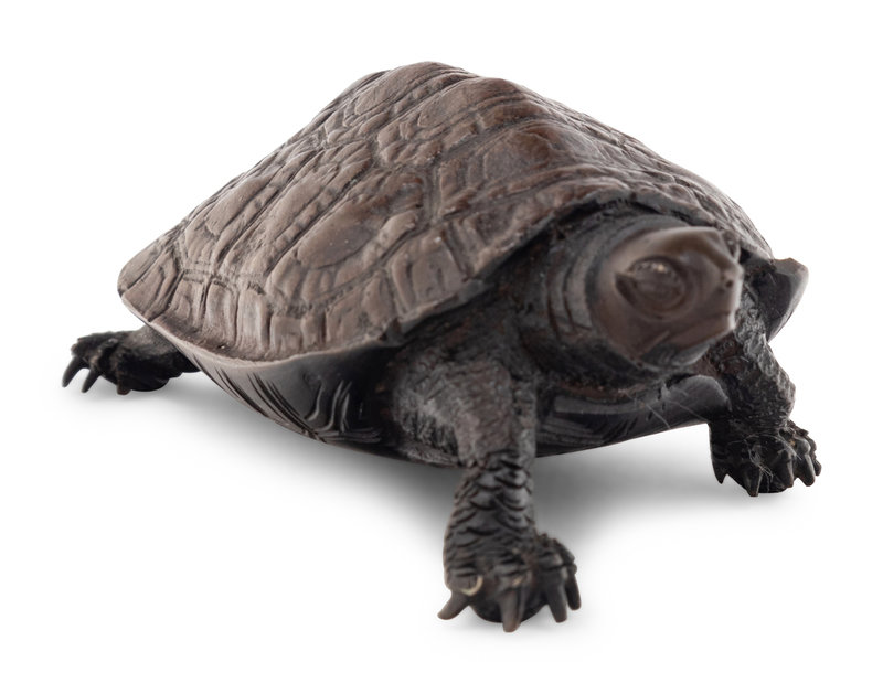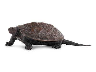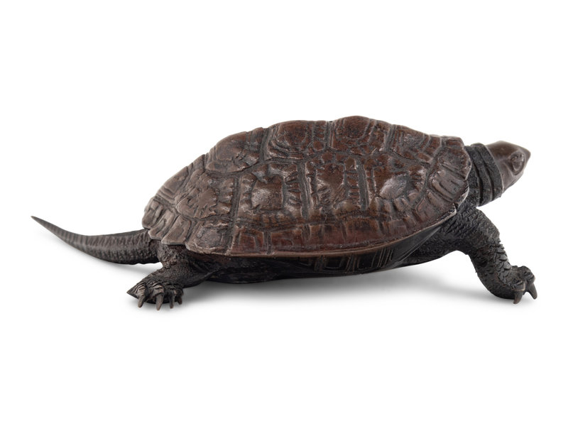 naturalistically modelled, depicting a crawling turtle with its head emerging from its carapace, together with the original wood box.
